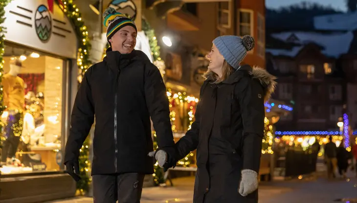Step into a world of romance at Blue Mountain Village, where cobblestone pedestrian streets lead to a lively holiday atmosphere.